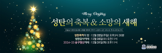 성탄축하의 밤 & 소망의 새해 12월22일(주일) 오후5시 30분: 성탄축하의 밤 12월25일(수) 오전11시: 성탄감사예배 12월31일(화) 오후11시: 24-25 송구영신예배 |